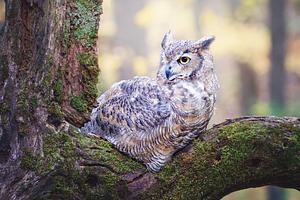 This image features a Great Horned Owl relaxing on a tree in a forest in Howell, Michigan, USA. This rescued owl, named Archimedes, is a wildlife ambassador resident at the Howell Nature Center.